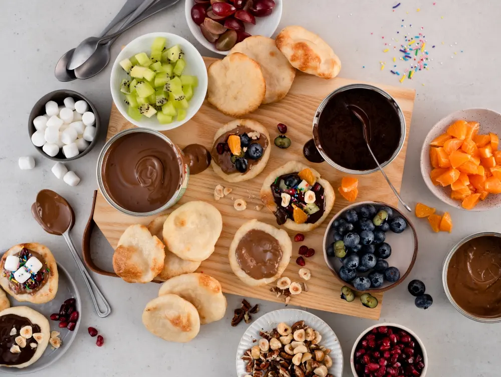 - Au centre de la table, servir les fondues, accompagnées des mini pizzas et de toutes les garnitures.