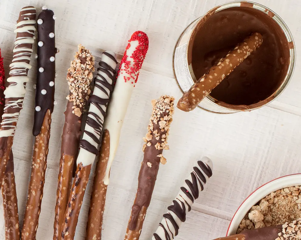 - Tremper le bretzel au ¾ dans le chocolat et le rouler dans la garniture.