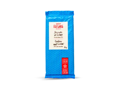 Découvrez notre chocolat Biscuits & Crème. Un chocolat blanc délicieux qui contient des micros biscuits. Un vrai régal !