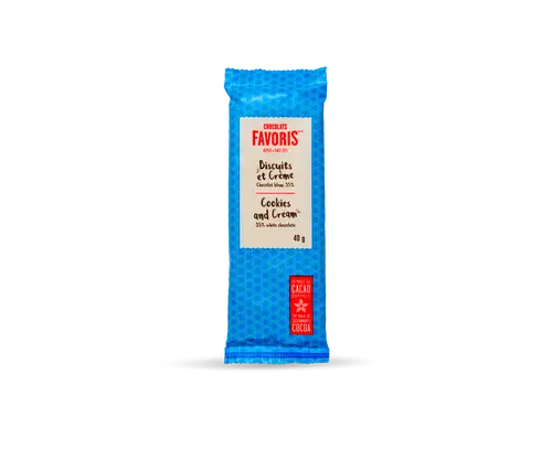Très populaire, notre chocolat Biscuits et crème est en fait un chocolat blanc qui contient des morceaux croquants de biscuits au chocolat… Vous savez, celui que tout le monde adore? Il plaît autant aux petits qu’aux grands!