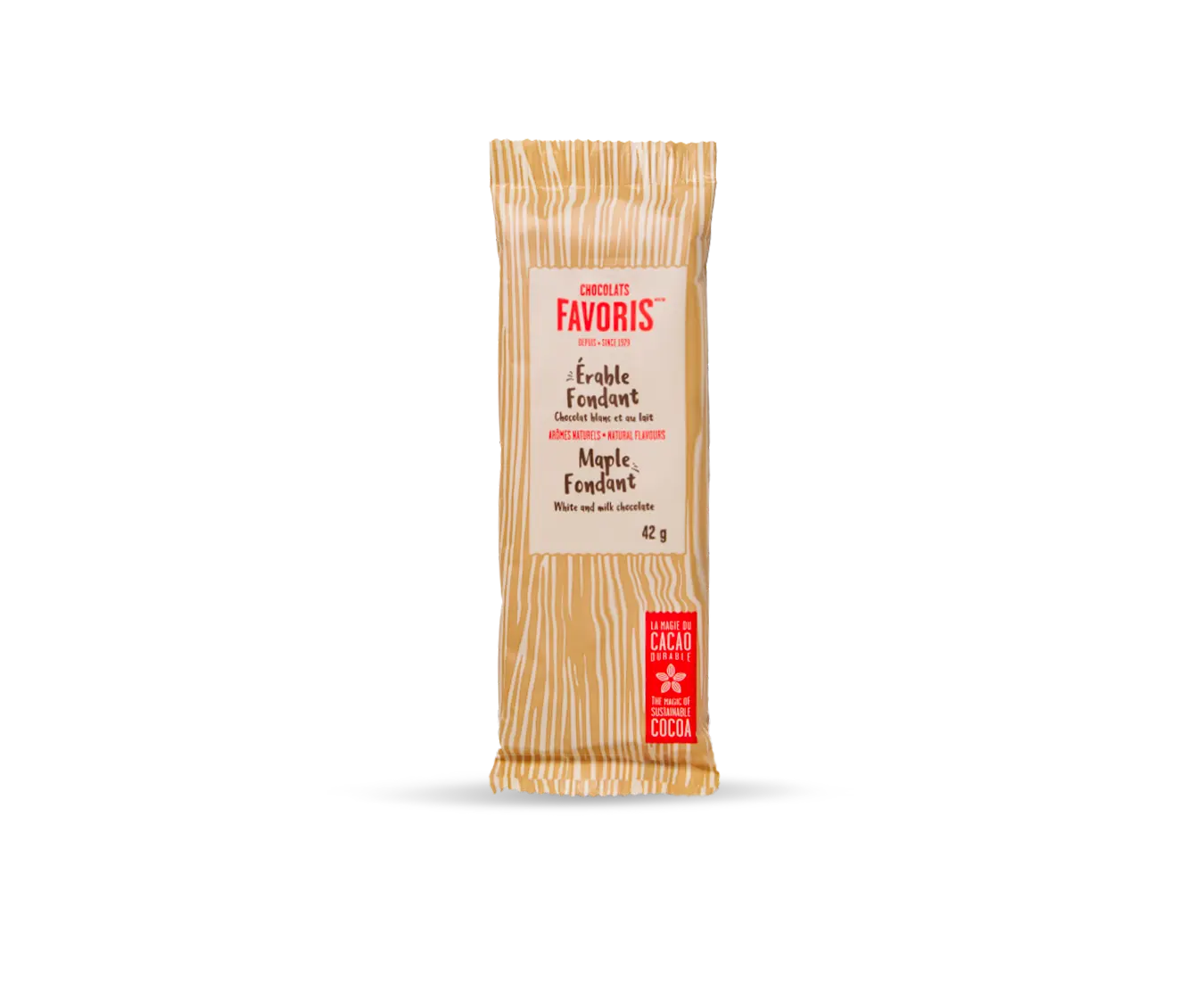 Découvrez cet amalgame exquis entre le chocolat blanc onctueux et la saveur unique de l’érable. Cette création qui incarne à la perfection la plus pure des traditions québécoises saura assurément vous rappeler ces journées de printemps passées à la cabane à sucre. Gare à la nostalgie sucrée !