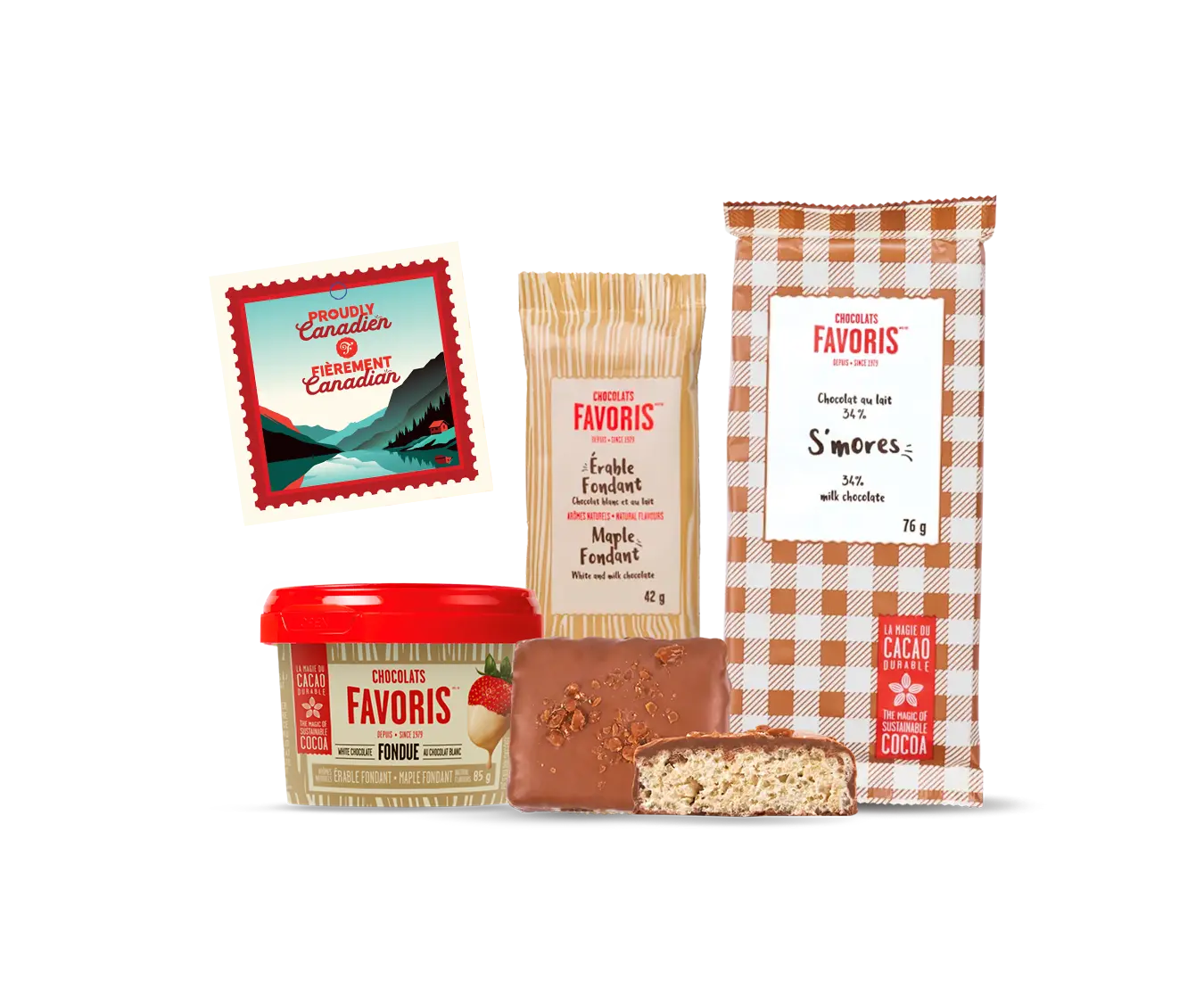 Faites plaisir avec un ensemble cadeau chocolaté qui réunit nos créations les plus populaires. Idéal pour célébrer les grandes occasions ou simplement gâter un passionné de chocolat, ce coffret gourmand comprend : une petite tablette de chocolat érable fondant, une grande tablette de chocolat s’mores, une mini fondue au chocolat érable fondant et un crousti Dulce de leche, ainsi qu’une petite carte de la collection Fièrement Canadien. Prêt à offrir et à savourer !