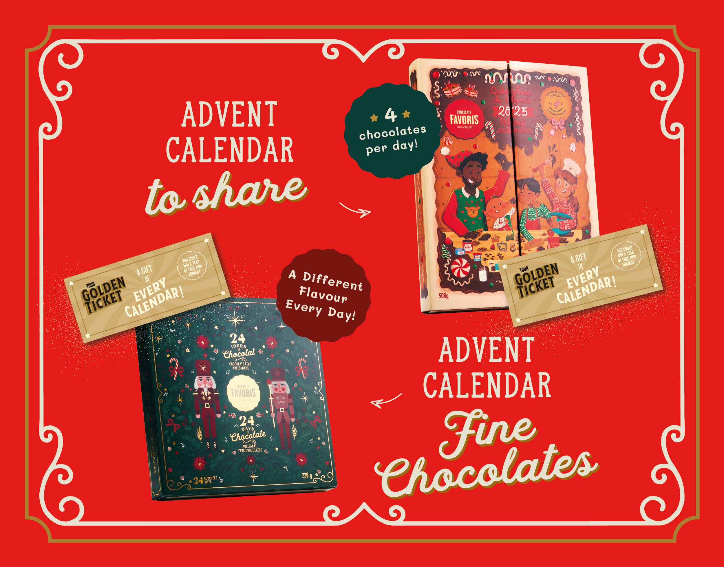 Each calendar is automatically a winner since it contains a golden ticket redeemable for a little chocolate surprise. The grand prize? 🎉 1 year of mini fondue!