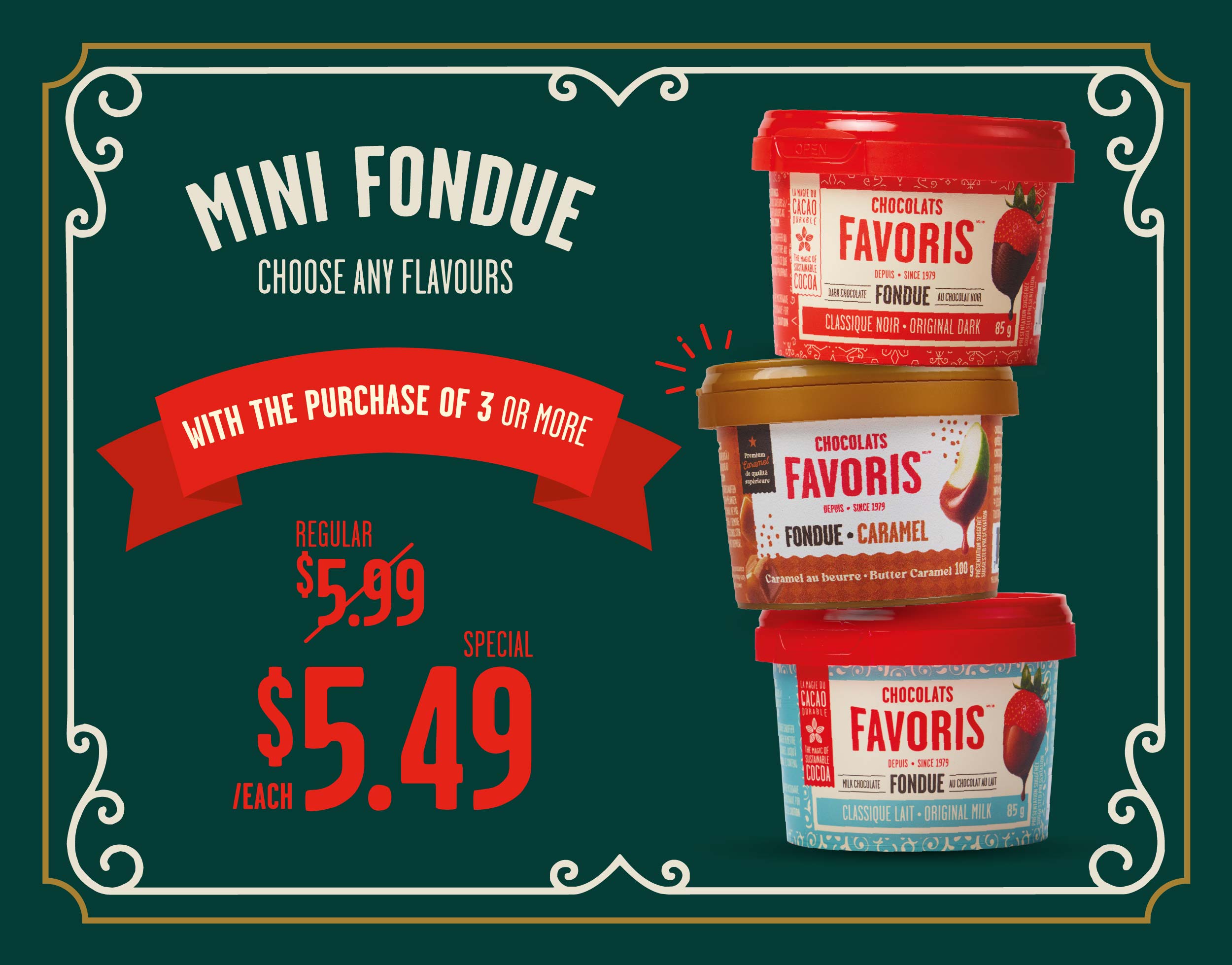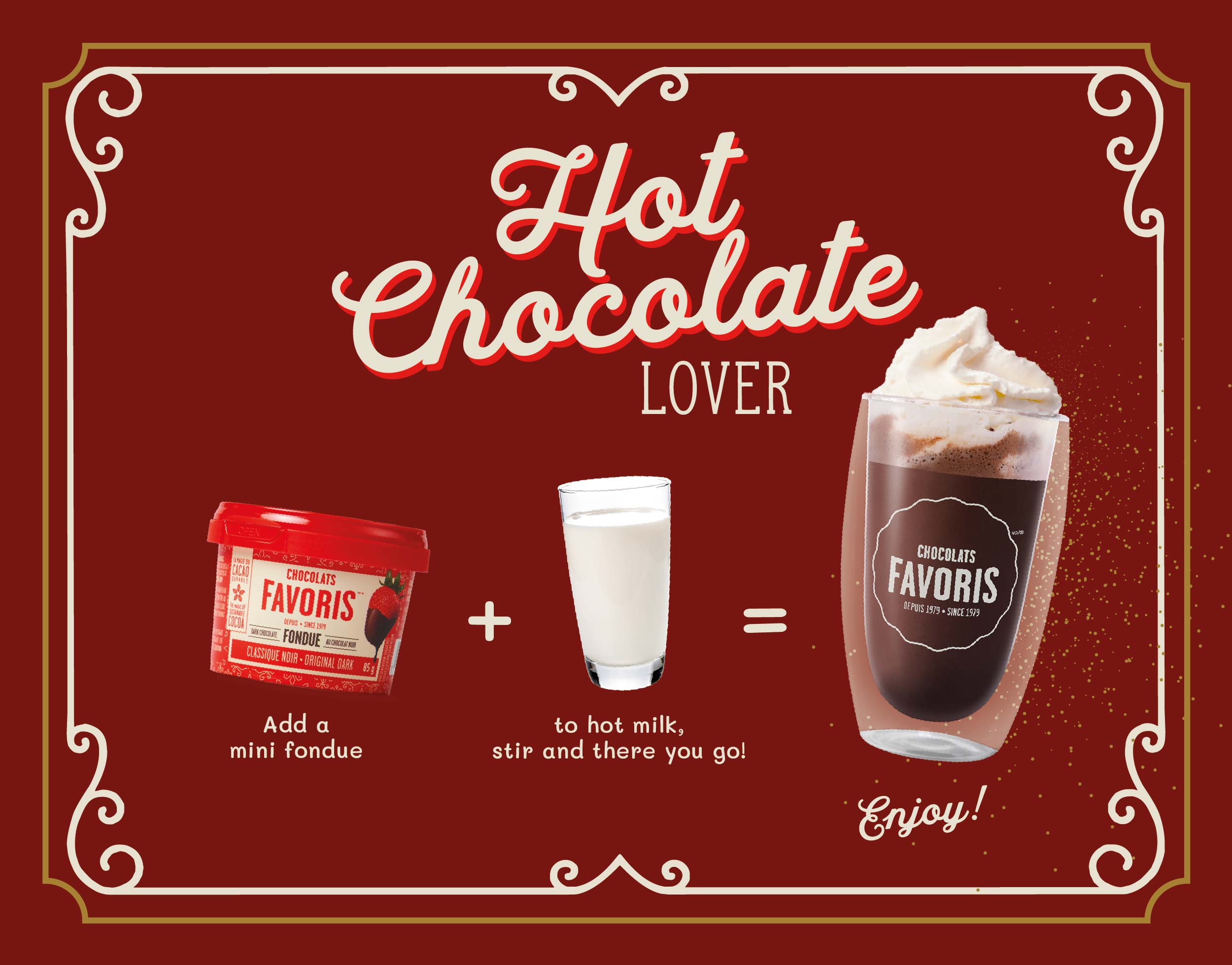 Create your own blend for a hot chocolate just the way you like it! Simply mix your favourite mini fondue flavours with hot milk, and you’re done!