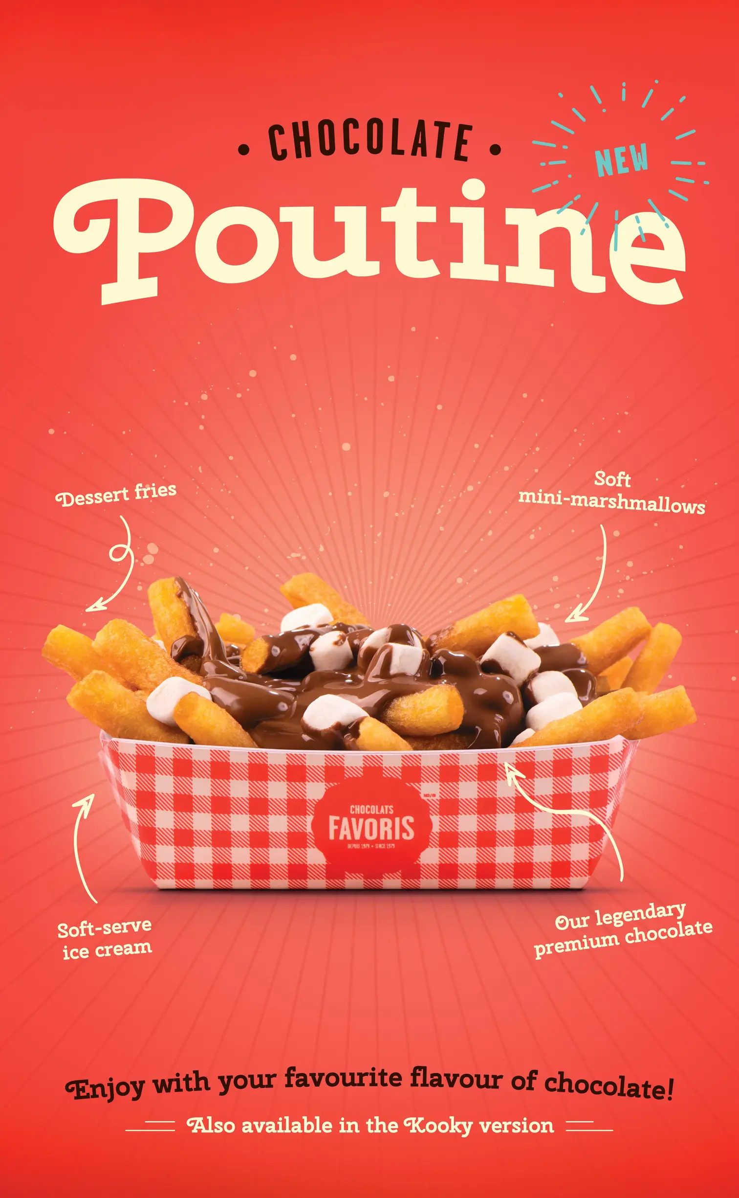 Chocolats Favoris launches the famous ChocoFav Poutine. Dessert fries in the style of churros and mini marshmallows on a bed of soft serve ice cream, all topped with your favorite flavour of our legendary chocolate!