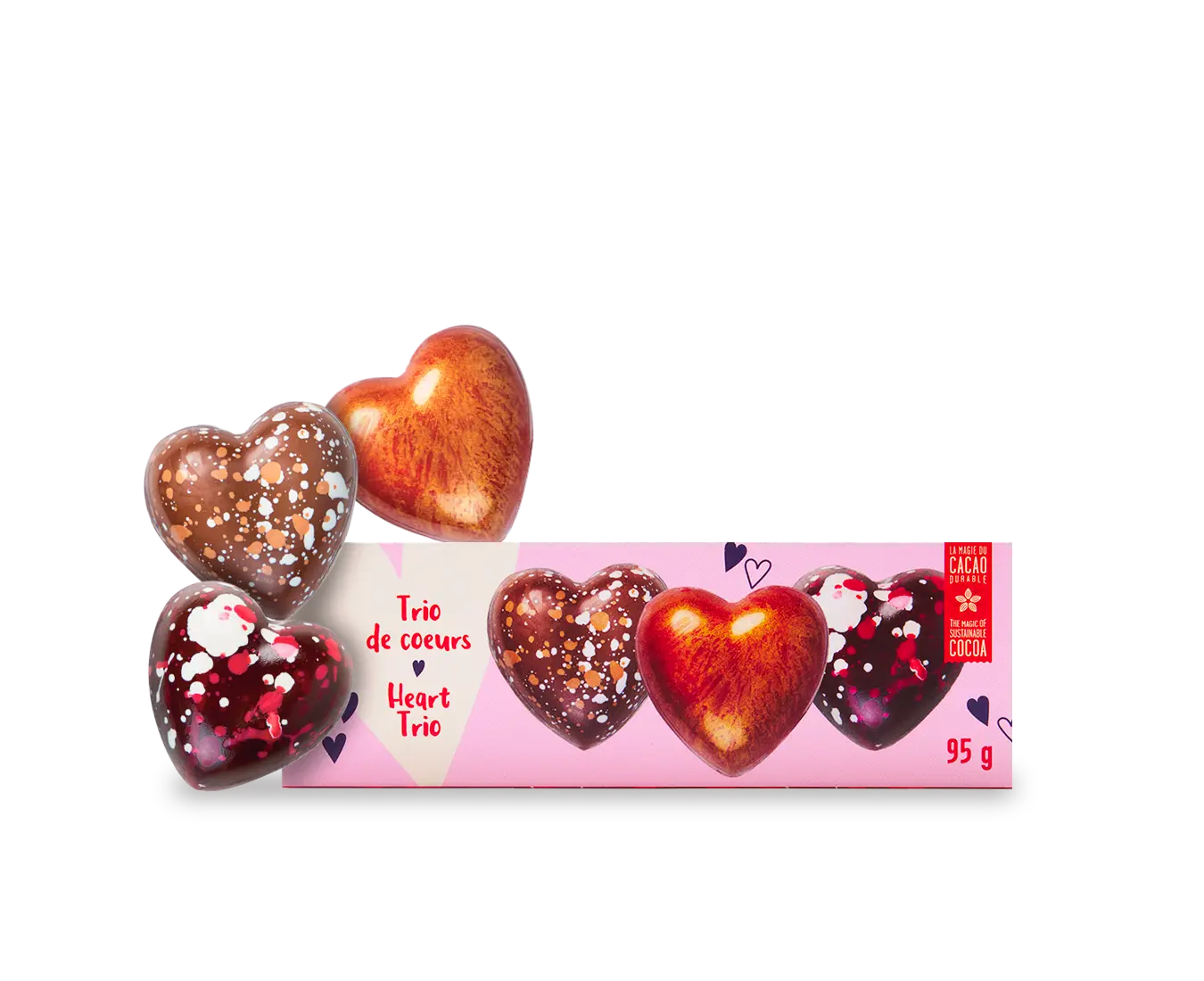 Three hearts are better than one! The ultimate trio contains our famous Cherry Fondant, the Hazelnut Praline and the limited-edition Raspberry dark. .