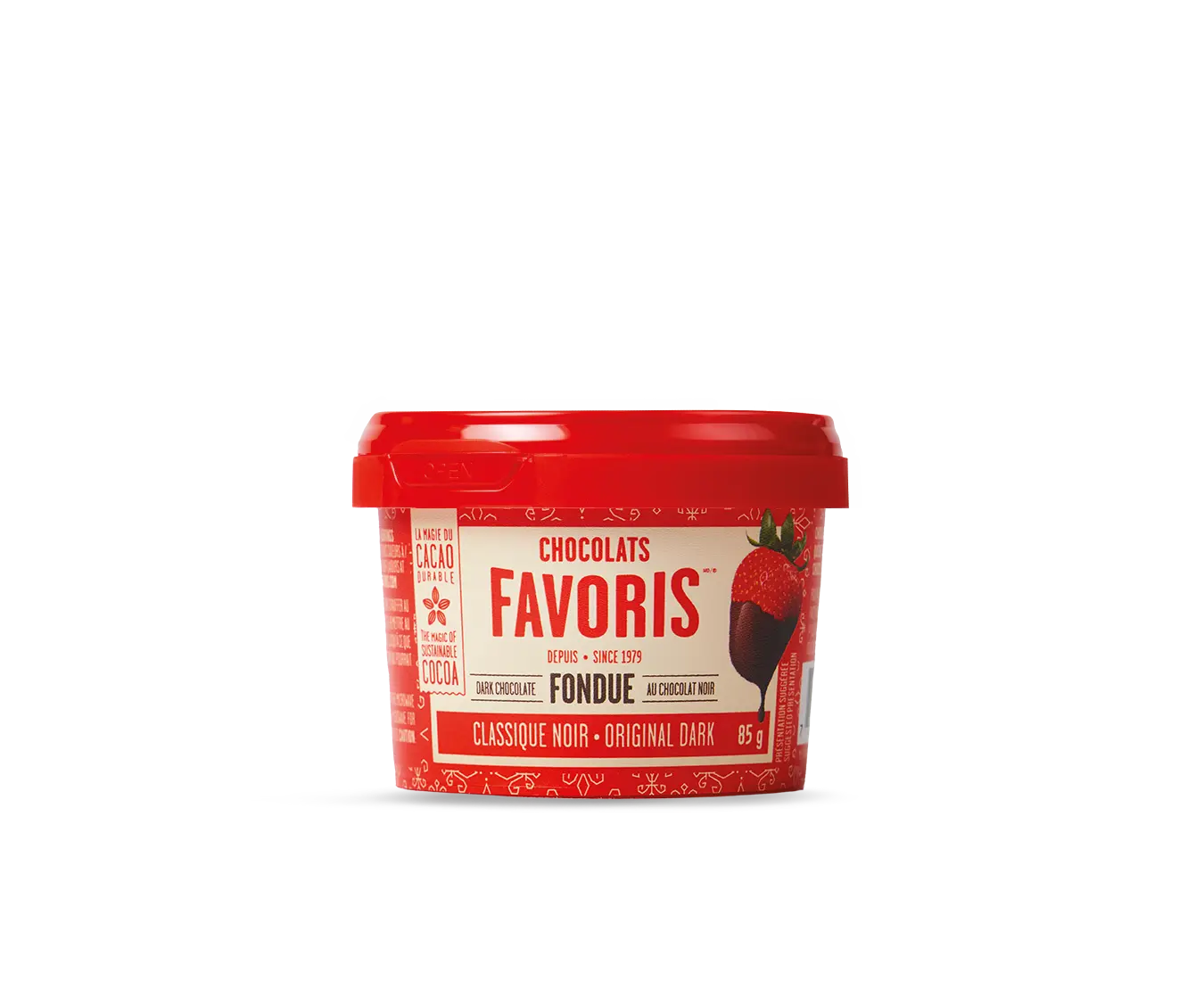 Discover the all-new mini chocolate fondue snack you've always dreamed of! Quick and easy to prepare: it's ready in just 1 minute in the microwave! It contains the same delicious oil-free chocolate as our small and large fondues that have been making your mouth water for 10 years now! How to prepare it? Remove the lid and heat in the microwave in 15-second intervals until melted! Enjoy!