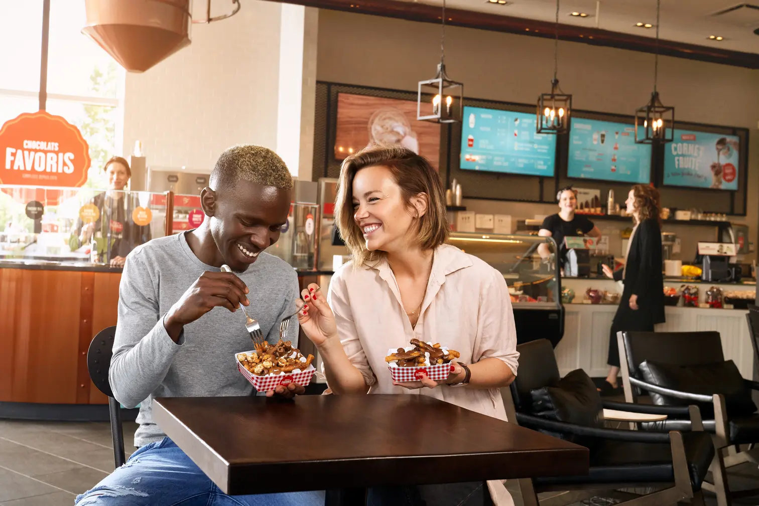 Chocolats Favoris launches the famous ChocoFav Poutine. Dessert fries in the style of churros and mini marshmallows on a bed of soft serve ice cream, all topped with your favorite flavour of our legendary chocolate!