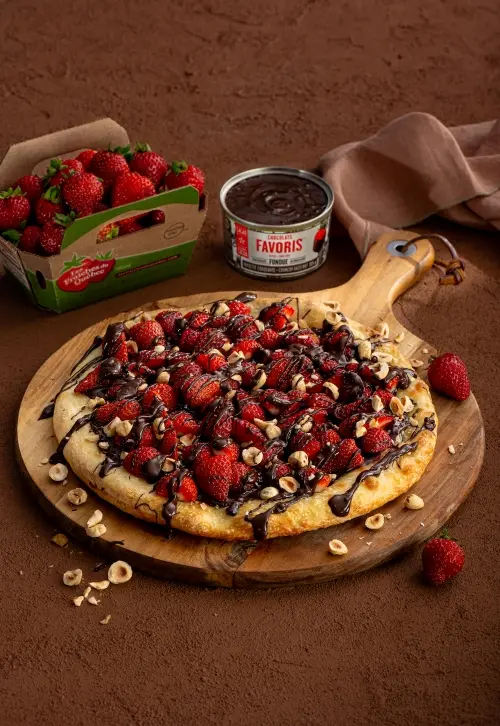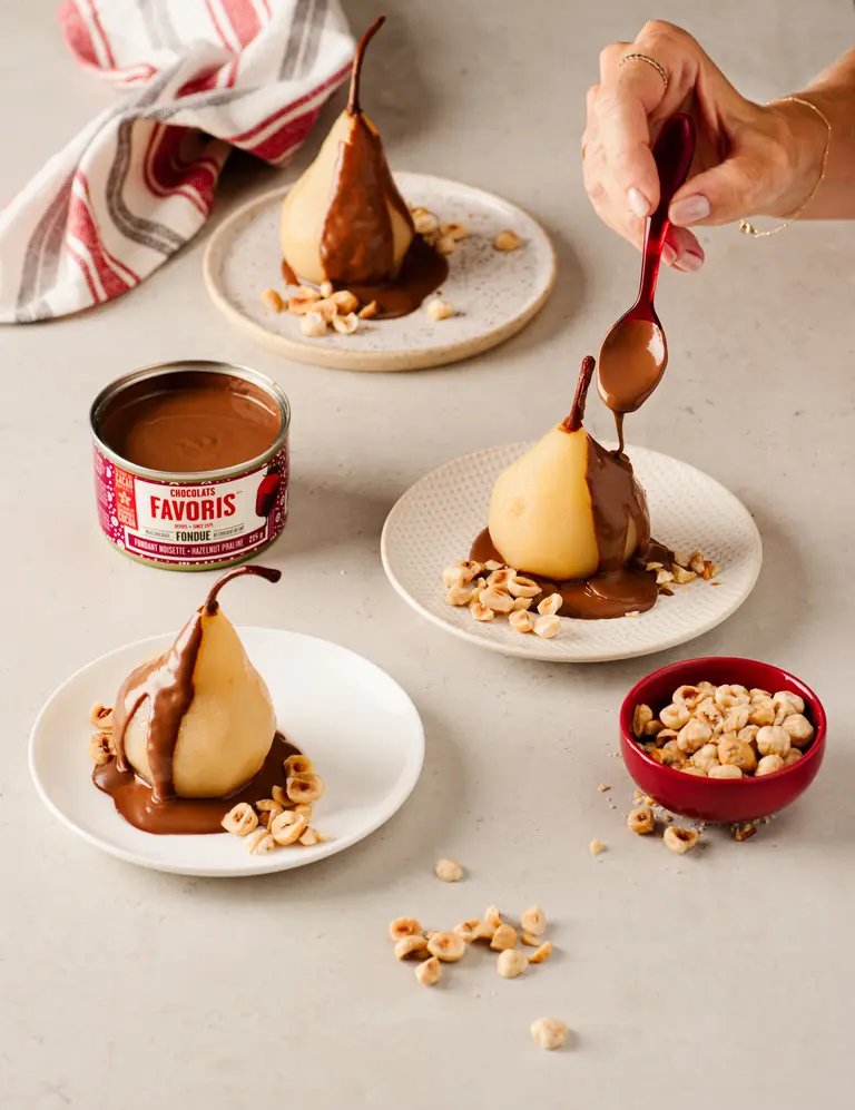 Meanwhile, melt the chocolate fondues in the microwave, then pour them into a bowl set over a double boiler.