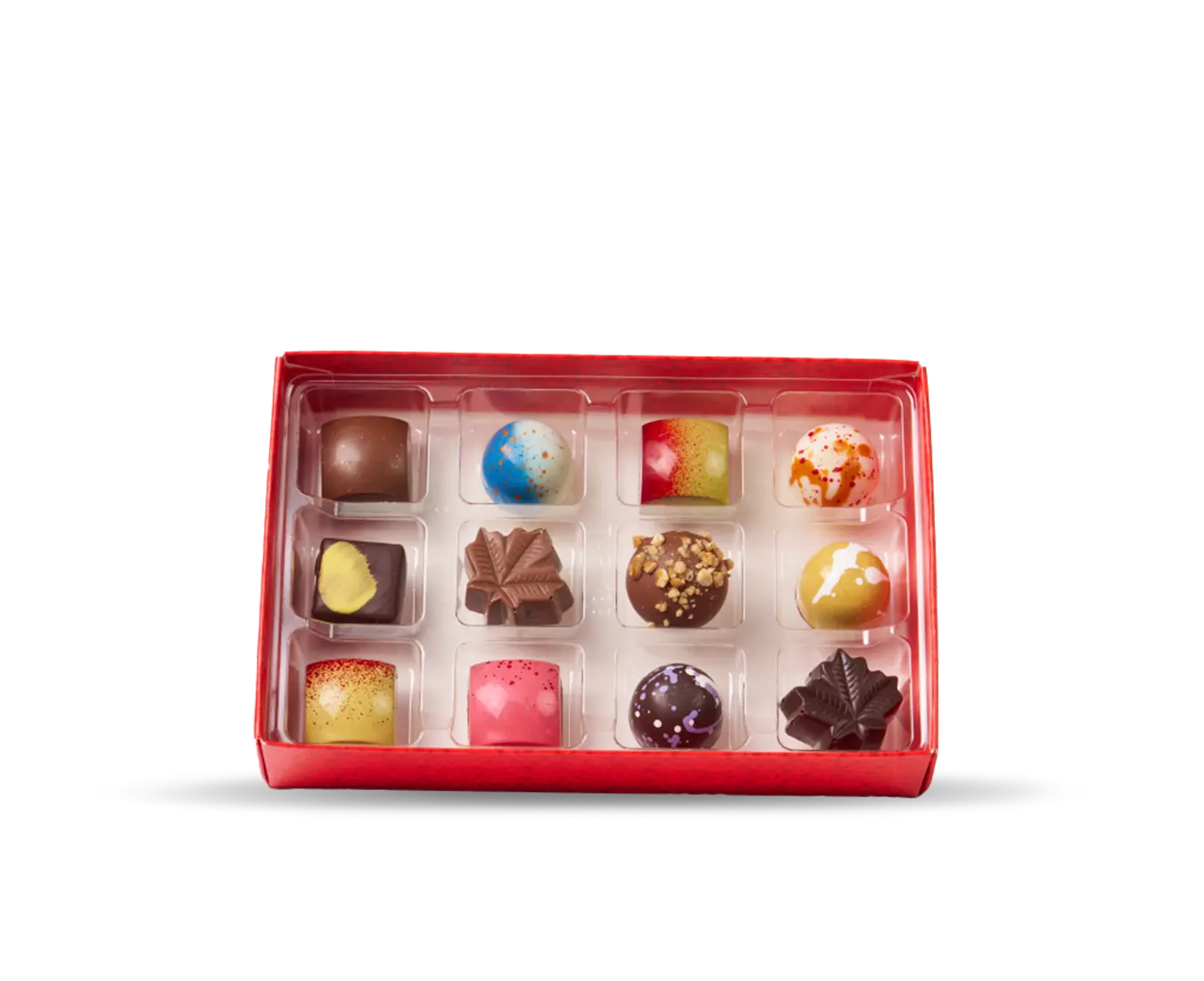 Nos maîtres chocolatiers ont concoctés à la main plus d'une trentaine de chocolats fins regroupés à travers différentes familles de saveurs. On vous présente nos plus grand succès en boîtes de 6, 12, 24 ou 48 morceaux. Note : afin de maximiser la saveur et la fraîcheur de ces chocolats, assurez-vous de les conserver dans un endroit frais et sec entre 15 et 20° et de les consommer dans les 15 jours suivant l’achat. *Photos et saveurs à titre indicatif seulement. Le contenu de la boîte peut varier.