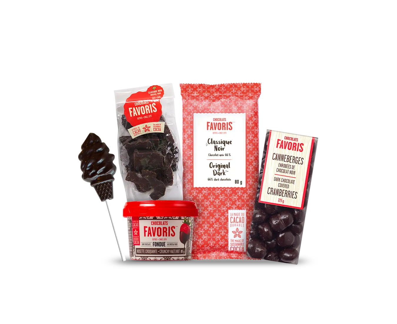 Contenu : un suçon au chocolat classique noir, une mini fondue noisette croquante, une grande barre de chocolat classique noir, des canneberges enrobées de chocolat noir et un sac de bouchées de noël classique noir.