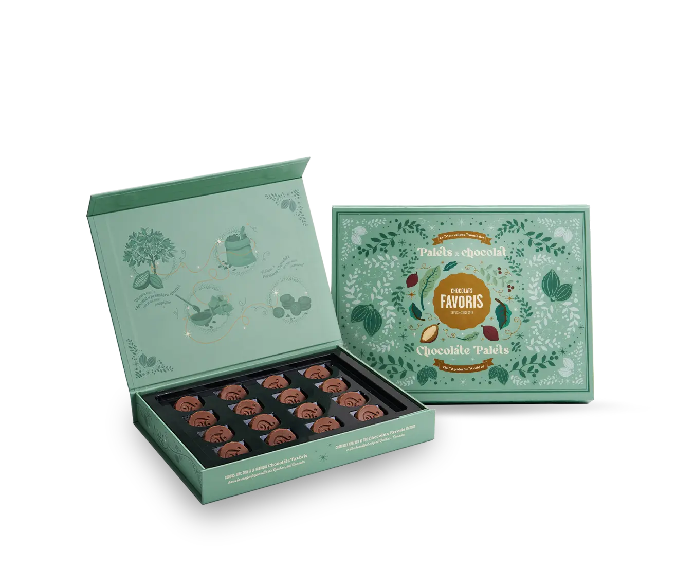 Nos boîtes de palets renferment de véritables morceaux de chocolat pur, sans garniture – simples, riches et irrésistibles. Parfaites à offrir en cadeau ou à savourer lors d’une pause gourmande.