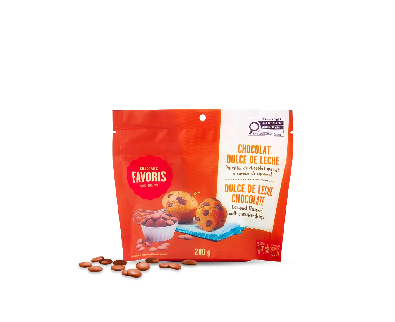 Du vrac en sac! Oui, nos pastilles de chocolat sont vendues en sac dans vos saveurs favorites : Classique lait, Classique noir, classique blanc et Dulce de leche. Ajoutez une touche de magie dans vos gâteaux et pâtisseries!