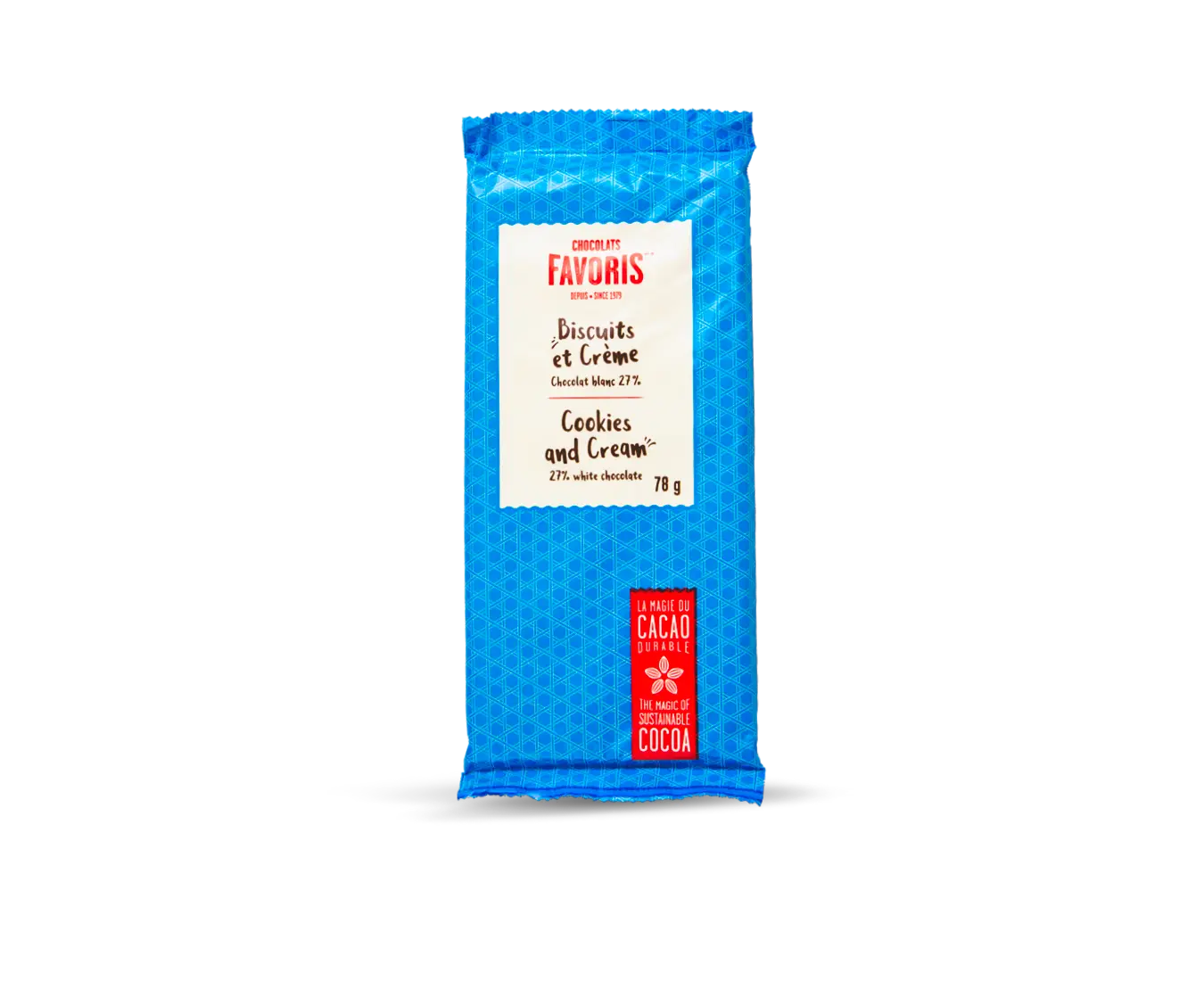 Je suis un classique qui saura plaire autant aux petits qu’aux grands ! Vous serez surpris par mes croquants morceaux de biscuits au chocolat et par l’onctuosité du doux chocolat blanc. Une bouchée et vous replongerez dans votre enfance... n'oubliez pas le verre de lait!