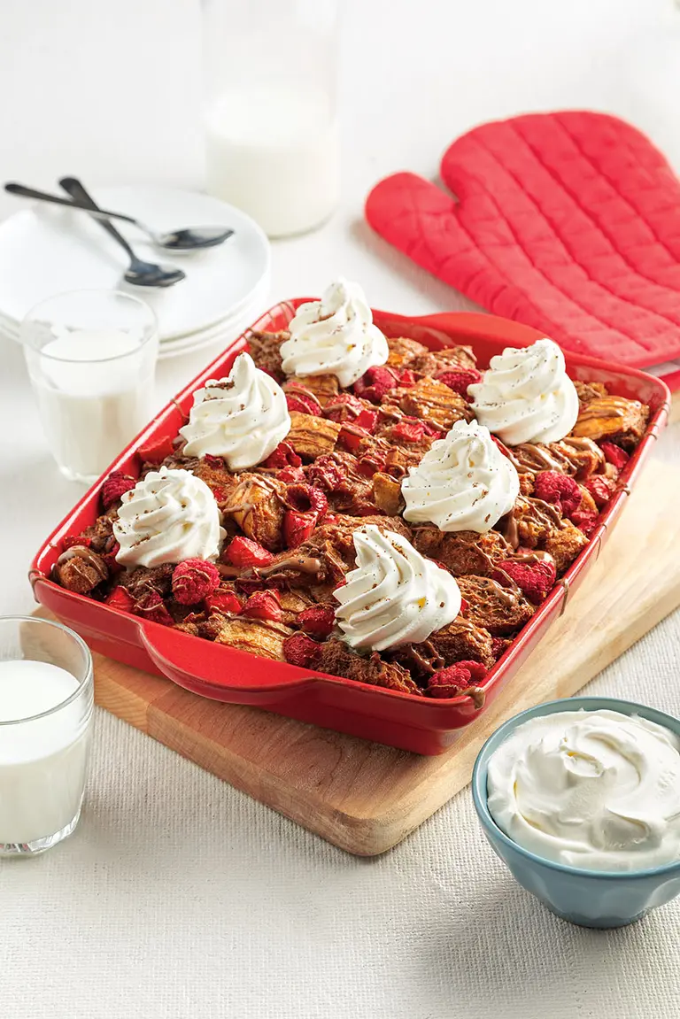 - Dans un autre bol, fouetter les œufs avec le lait, la vanille et la moitié de la fondue. Déposer la boîte contenant le reste de la fondue dans un bol d’eau chaude.