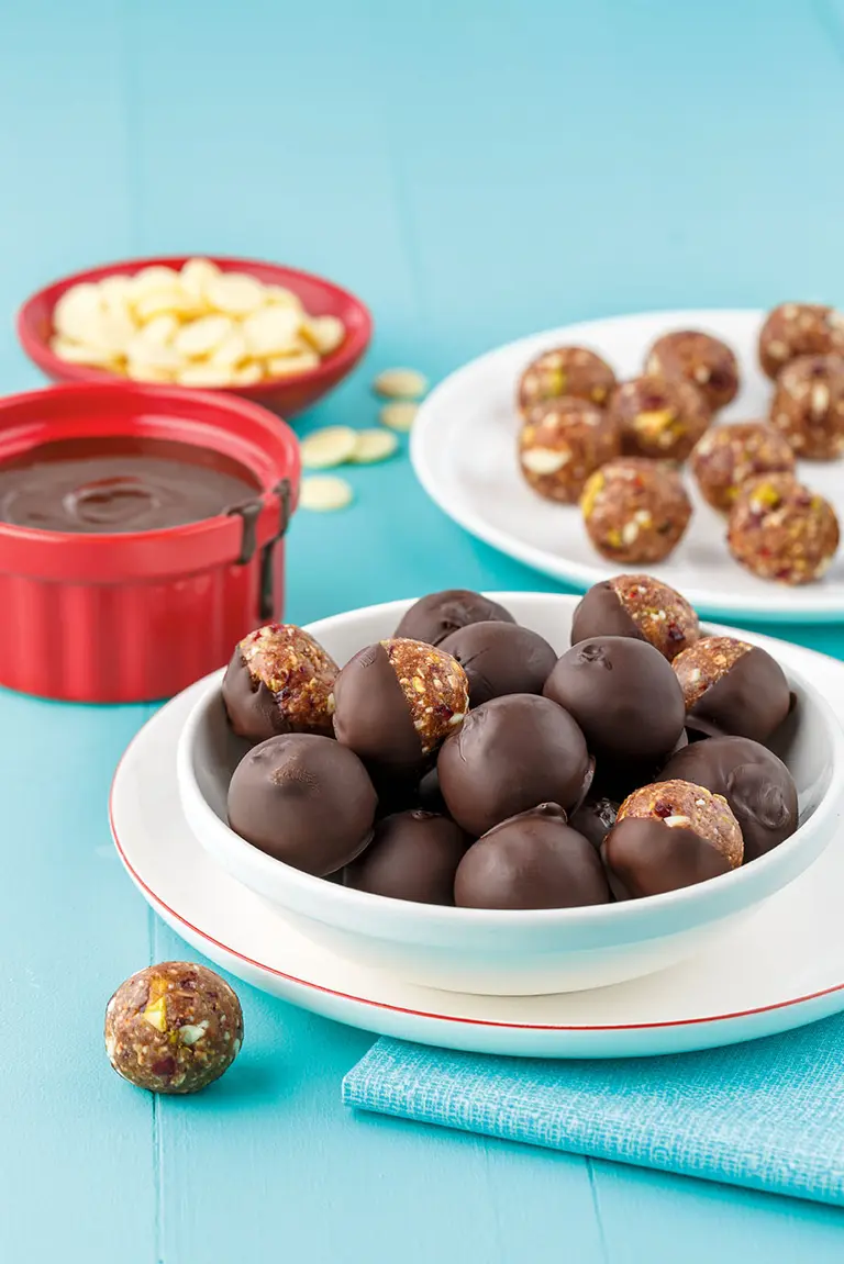 Boules d'énergie aux deux chocolats, pistaches et framboises